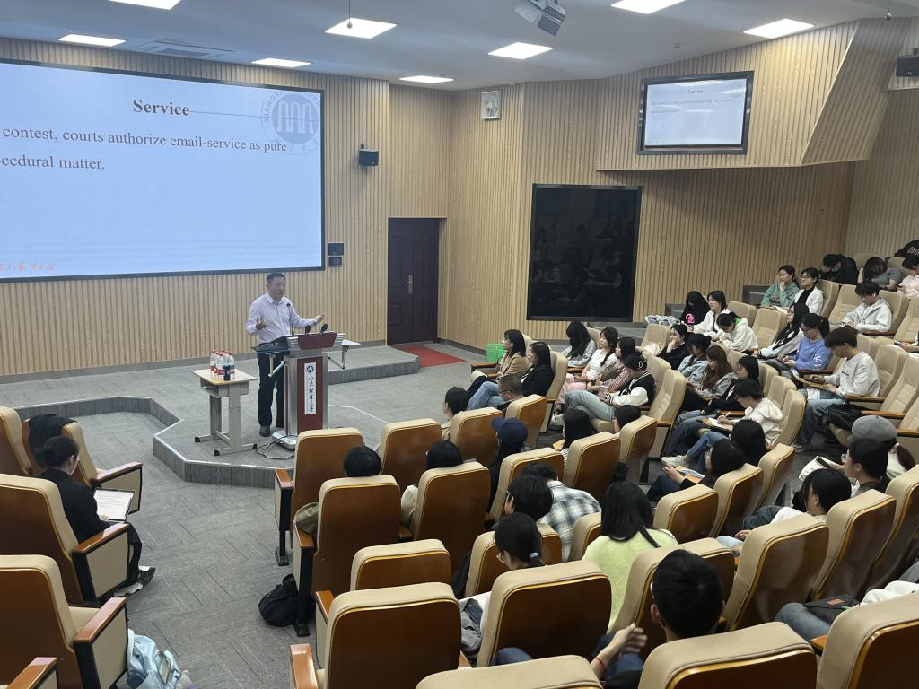 在讲座期间,覃斌武教授以幽默风趣的讲话风格和生动形象的类比举例,向在座师生剖析了中、美两国民事诉讼程序法的不同,以近年来美国法院对于我国跨境电商行使域外管辖权的案例为主旨,以其自身经办的案件为切入口,分析了此类案件数量激增的原因、讲解了法律争议焦点、提出了破解方案。覃斌武勉励在座同学,要常怀爱国之心,将法律人的职业追求同家国大义相结合,开阔眼界看世界。之后,覃斌武还为在场的同学剖析了刚刚举办的第十二届国际刑事法院模拟法庭比赛赛题,并为脱裤吧