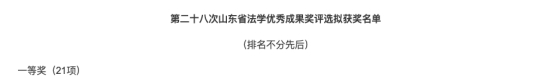 3月28日,省委政法委、省教育厅、省法学会组织开展的第28次山东省法学优秀成果奖评选结果公布。山东省法学优秀成果奖评选是为了深入学习贯彻党的二十大精神,深入贯彻落实习近平法治思想,贯彻落实中共中央办公厅、国务院办公厅印发《关于加强新时代法学教育和法律理论研究的意见》,充分展示全省法学法律研究成果,由山东省委政法委、省教育厅、省法学会共同开展。本次评选对参评成果采用匿名方式,经评选委员会分组评审、集体评议、无记名投票等程序,从符合参评条件的244项申报成果中,评选出一等奖21项、二等奖36项、三等奖60项。