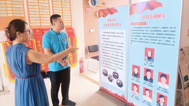 为进一步调研基层矛盾调解运行机制,调研活动第二站团队成员来到了利津街道津苑社区。其中,富有特色的“玉帛调解室”让队员眼前一亮,由7名女性调解员组成的调解队伍,充分发挥了女性亲切真诚、善解人意、耐心细致的特长。团队成员走进调解室,看案例档案,学工作经验,对不涉及个人隐私的资料进行了研读分析、拍照留存,获取了真实可信的一手资料,详细了解调解室的运行机制和工作成果,并就基层社会治理中频发的矛盾类型和成因以及化解方法与工作人员进行探讨交流,实践队员说:“以往更多的是从基层治理网格化建设的运行机制等宏观角度思考,忽视了对网格员自身特点的认识,这次调研为我们提供了更多的思考方向。”