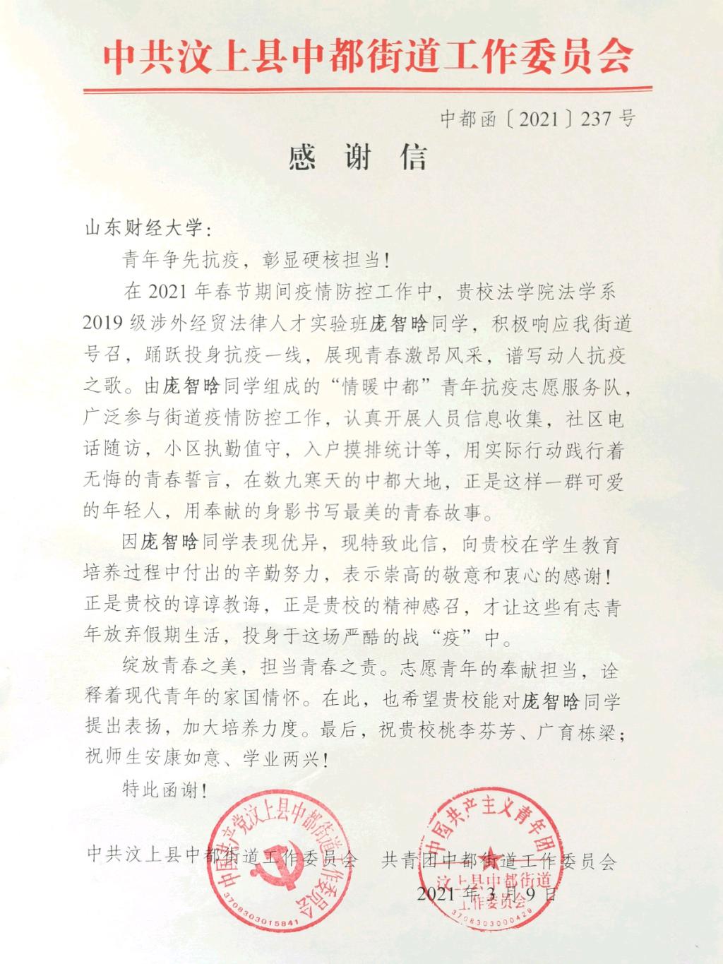 收到来自中共汶上县中都街道工作委员会的一封感谢信,对疫情期间奋斗在一线的抗疫青年志愿者庞智晗同学进行了表扬,对其在抗击疫情的紧要关头,积极响应号召,主动投身疫情防疫一线,充分发扬志愿服务精神及认真负责的工作态度给予了高度肯定,同时对学校的人才培养工作表示感谢。