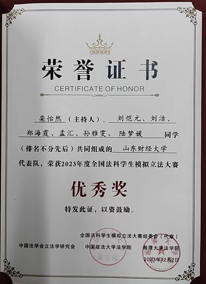 承办的2023年度全国法科学生模拟立法大赛成绩公布,由刘奇耀老师指导,2022级涉外经贸法律人才实验班栾怡然同学作为负责人的作品《生成式人工智能服务管理规定(草案)》荣获2023年度全国法科学生模拟立法大赛优秀奖。