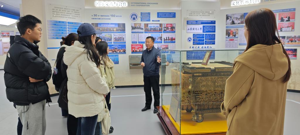 2023级法学四班是于洪良的联系学生班级。在参观中,于洪良围绕成就展的整体设计框架作了系统讲解。成就展由四个篇章构成,分别为“筚路蓝缕 以启山林”“一脉同行 蓬勃发展”“相与为一 踵事增华”“砥砺奋进 未来可期”。通过多种形式集中展示照片四百余张、图表五十余幅,收录报刊与论坛报道四十篇,设置多媒体互动十余处,并陈列历史文件、证书资料、书法作品及文创产品等实物百余件,内容丰富、脉络清晰。于洪良在讲解中强调,这里不仅凝聚着学校的红色历史记忆,更承载着几代师生的奋斗精神,希望同学们不负韶华,在学习和工作中继续保持昂扬姿态,爱校荣校,全面发展,努力成长为担当民族复兴大任的时代新人。