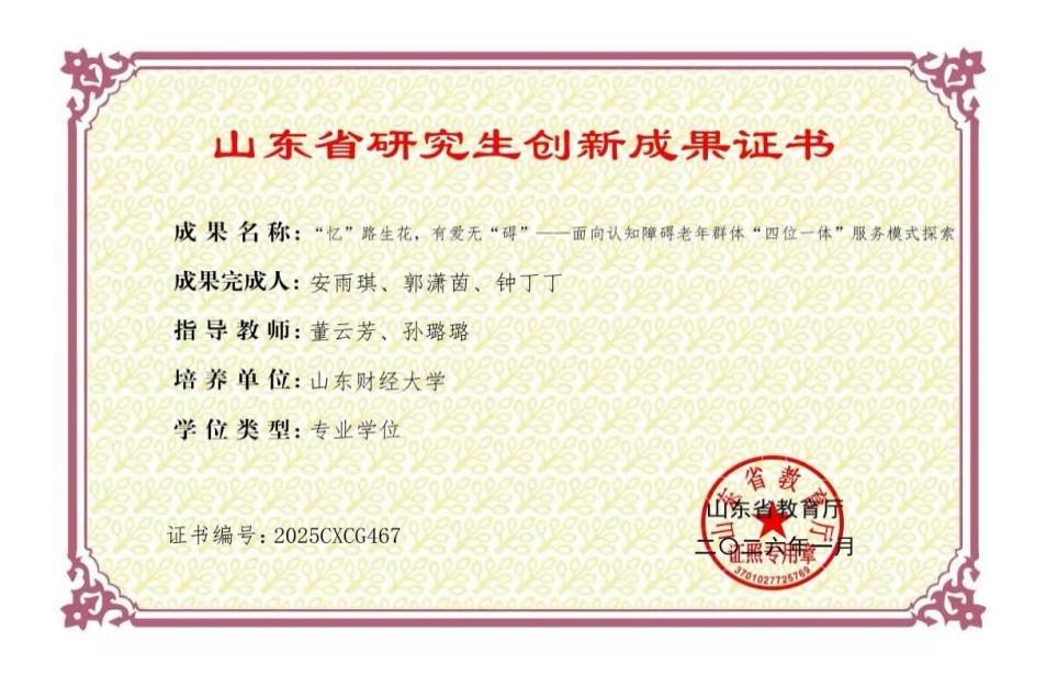 研究生团队申报的成果《“忆”路生花,有爱无“碍”——面向认知障碍老年群体“四位一体”服务模式探索》成功入选,该团队由2024级社会工作研究生安雨琪作为负责人,2024级社会工作研究生郭潇茵、钟丁丁为成员,董云芳、孙璐璐担任指导教师,展现了脱裤吧